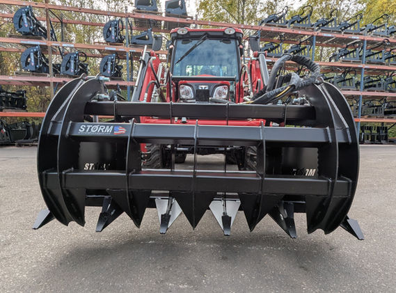 The Storm Rake Grapple is constructed with premium U.S. steel and is ideal for picking up and moving, rocks, logs, brush, debris, and other odd shaped or hard to lift material. The rear mounted cylinder design not only provides safety for the cylinders and fittings, but it enables this grapple to have a extra large 48" mouth vs the root grapples 36" mouth. Not available in John Deere or Euro quick attach.